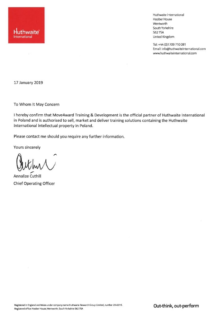 Move4ward Training and Development jest wyłącznym przedstawicielem i licencjonowanym partnerem Huthwaite International w Polsce. Jesteśmy jedynym autoryzowanym dostawcą szkoleń sprzedażowych SPIN® na terenie naszego kraju. SPIN® jest prawnie chronionym znakiem towarowym zarejestrowanym przez Urząd Patentowy Rzeczpospolitej Polskiej.